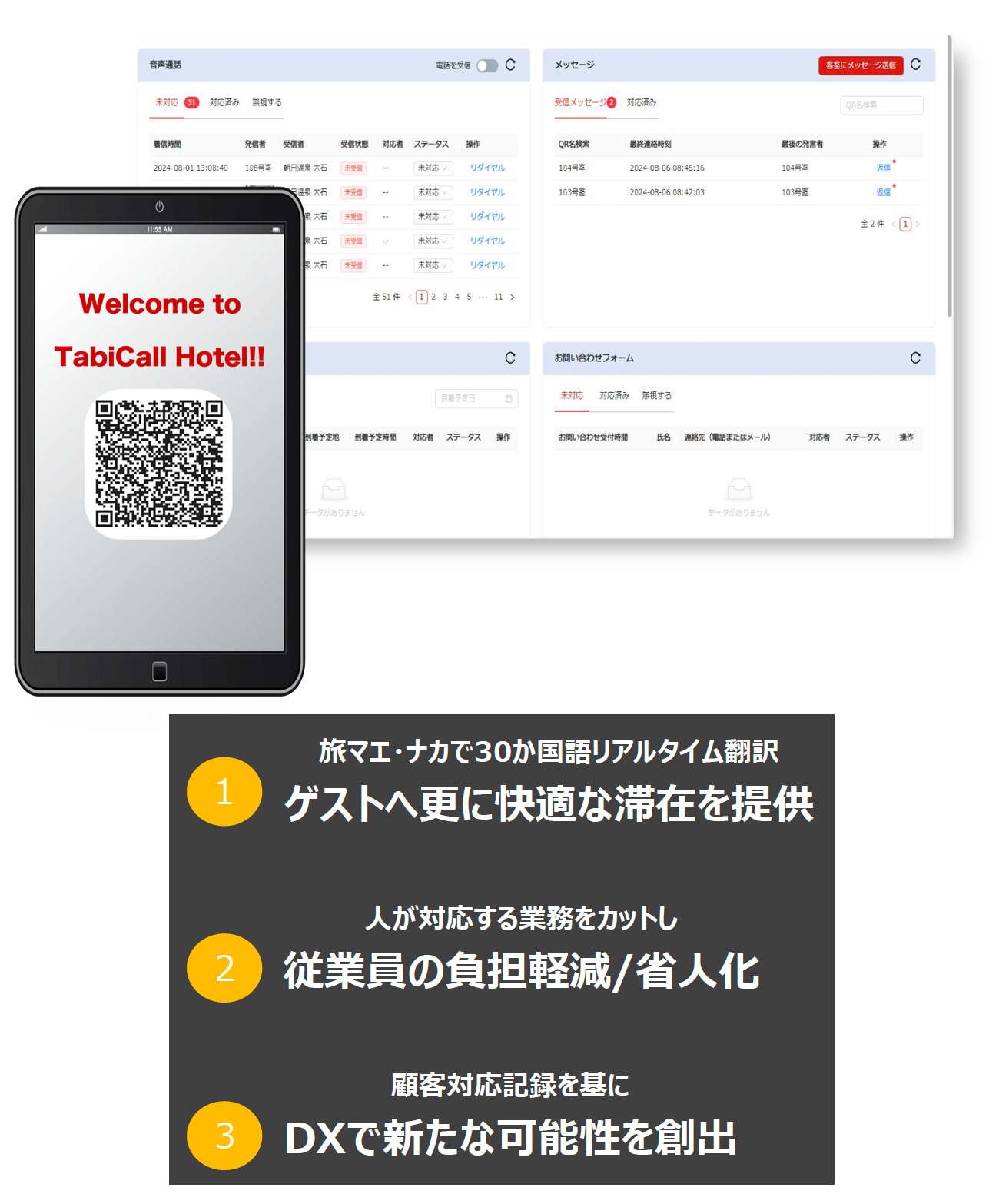 TabiCallが続々と採用されているポイントとなるのは、外国人ゲストへの対応の圧倒的な効率化を実現する一方でシンプルで使いやすく、安価でコストパフォーマンスに優れ、導入の期間が短くハードルも低い点だ。TabiCallの採用によりホテルや旅館は外国人ゲスト対応に関するスタッフの負担を削減でき、コスト削減と顧客満足度の向上を実現することができる。