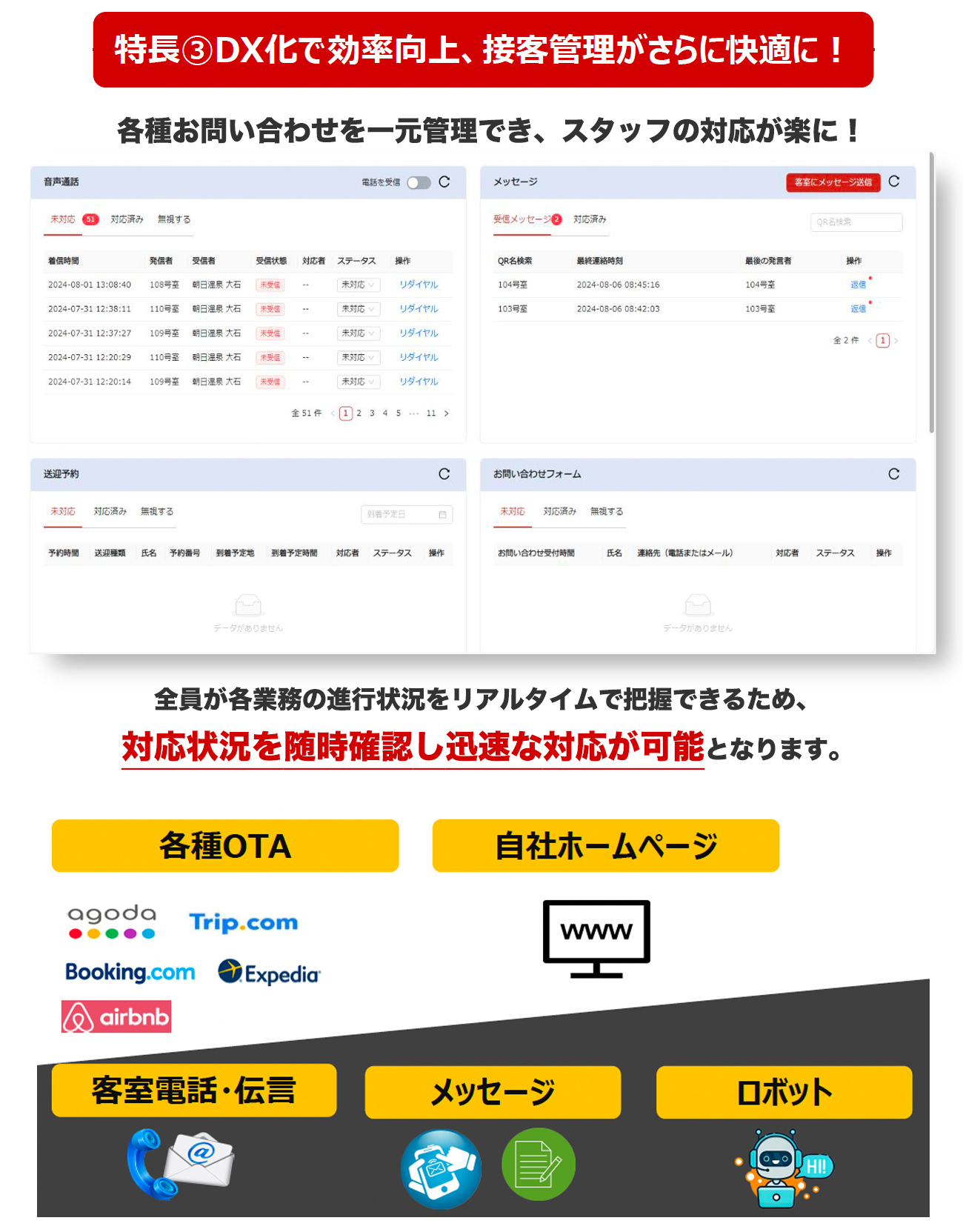 ゲストからの問い合わせを一元管理可能。