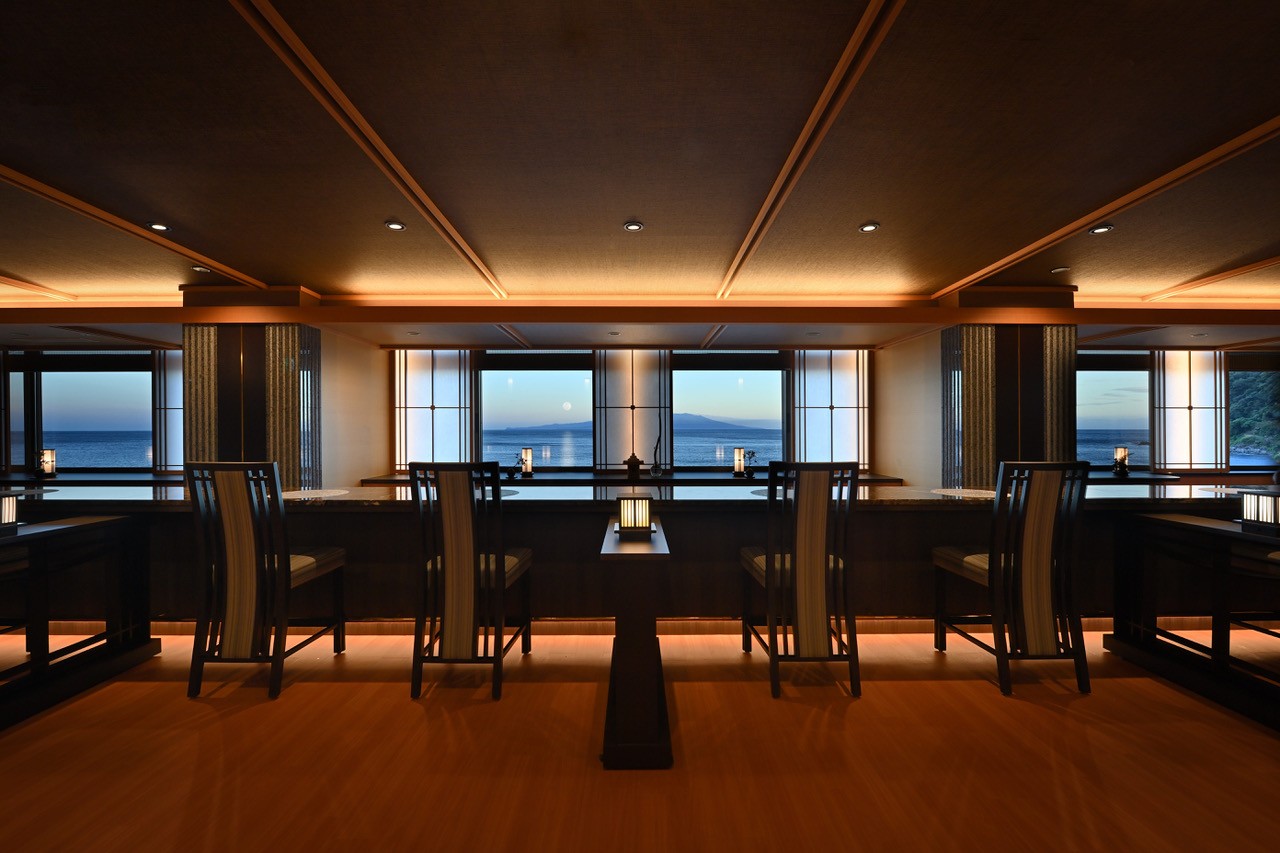 静岡県賀茂郡東伊豆町北川温泉の日本旅館「望水」は2024年夏、お客さまの滞在スタイルの選択肢を増やすととともに、働き方の改革をふまえ、3Fにムーンロードダイニング「ときの舟」、個室ダイニング「千年庵」を創造した。特にムーンロードダイニング「ときの舟」で、カウンター越しにお料理を提供するのは、調理師を中心としたチーム。従来の旅館における調理師は裏方のイメージが強くある中、石井調理長は人が成長するにはどのようにしたらよいか常にアンテナを立て、調理師にも表舞台となるステージを作りたかったのだ。そのような環境を通しながら、技術の向上は基より、人として自己成長を感じることのできる時間を過ごしてもらいとたいという強い想いもあった。また、望水では「成長支援プログラム」というものがあり、全員がまずは想い出つくりクリエーターとしてスタートし、関わる人達との想い出つくりのお手伝いに努めている。そして、経験や知識を他の人と共有し、支え合い、高め合う「利他の世界観」をベースに自身の成長と向き合いながら、「人を育てることができる人」を高く評価する組織文化を醸成している。この哲学や、調理長の想いを反映し創造したのが、ムーンロードダイニング「ときの舟」である。執行役員社長室長の林紀幸氏と調理長の石井洋次氏に、望水の信念である「旅館づくりは人づくり」の真髄についてインタビューした。