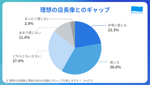 理想の店⻑像とのギャップに関する調査では、「⾮常に感じる(22.3%)」「感じる(36.0%)」と約6割の店⻑がギャップを感じていると回答した。