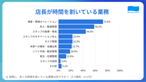 店⻑が時間を割いている業務については、「接客・現場オペレーション(72.6%)」が第1位、「売上・数値管理(58.3%)」が第2位、「スタッフの指導・育成(44.6%)」が第3位だった。イベント・キャンペーン対応や、サイト管理、競合調査、設備メンテナンスといった回答も得られたことから、店⻑は、現場業務に追われながら、⼀⼈で広範囲な業務を抱えている実態が明らかになった。