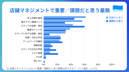 サービス業の職場マネジメントツール「はたLuckアプリ」を提供する株式会社HataLuck and Personは、ホテルやレストランなどのマネージャー(店長)職175名を対象にした「マネジメント業務の実態調査」を実施した。その結果、約6割が課題に感じている「スタッフの指導・育成」において、時間を割いている⼀⽅で⼗分には取り組めていないといったジレンマに陥っている実態が明らかになった。