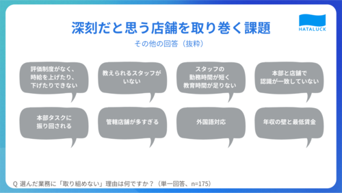 また、評価制度のなさ、外国語対応、短時間勤務者への対応、年収の壁といった回答も得られたことから、国籍・働き⽅といった多様性への対応にも課題を感じており、取り巻く環境が複雑化していると考えられる。