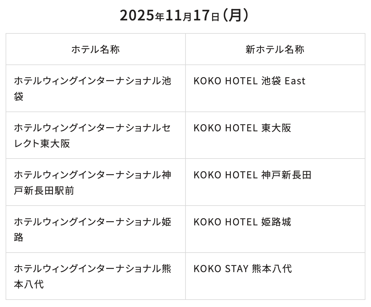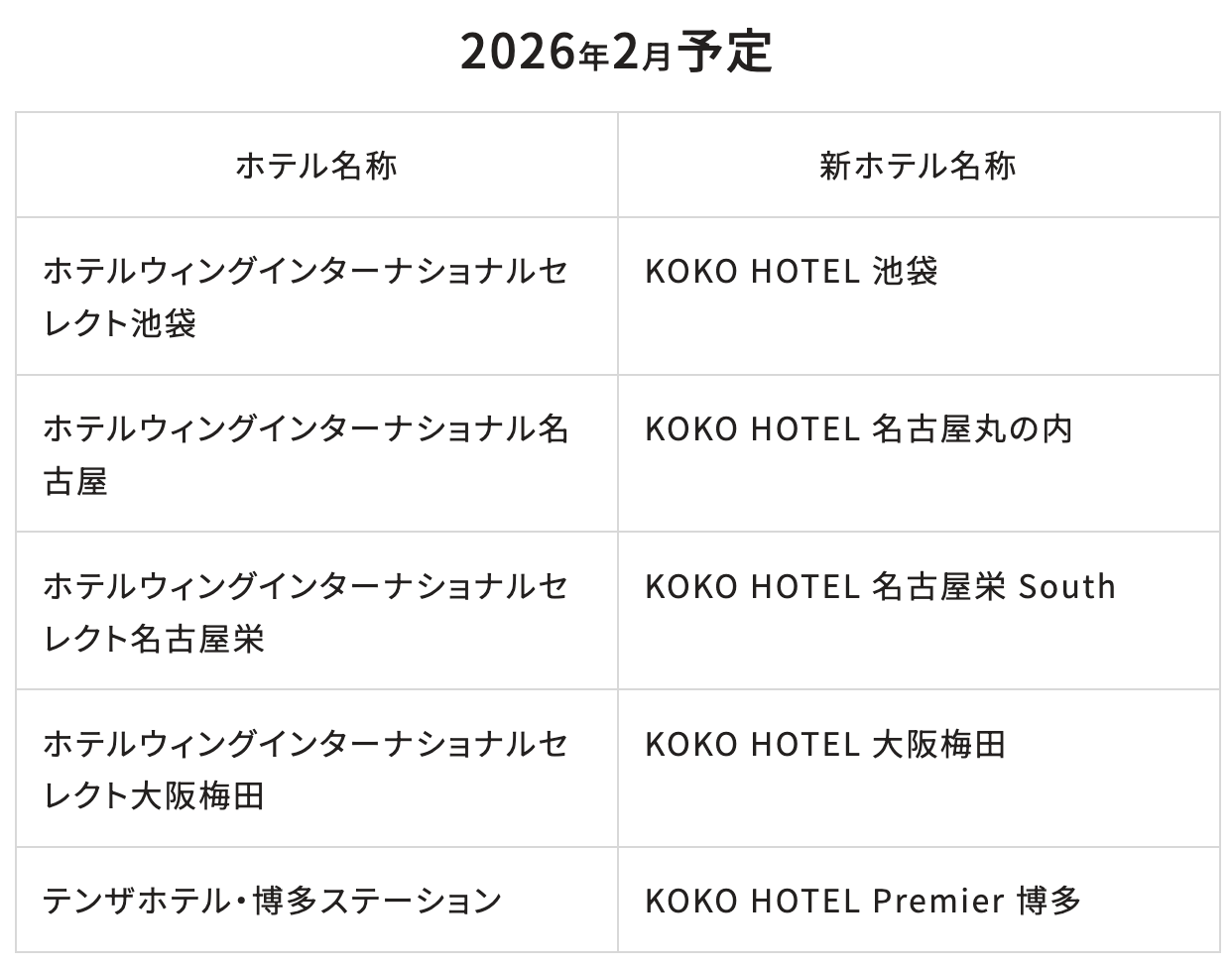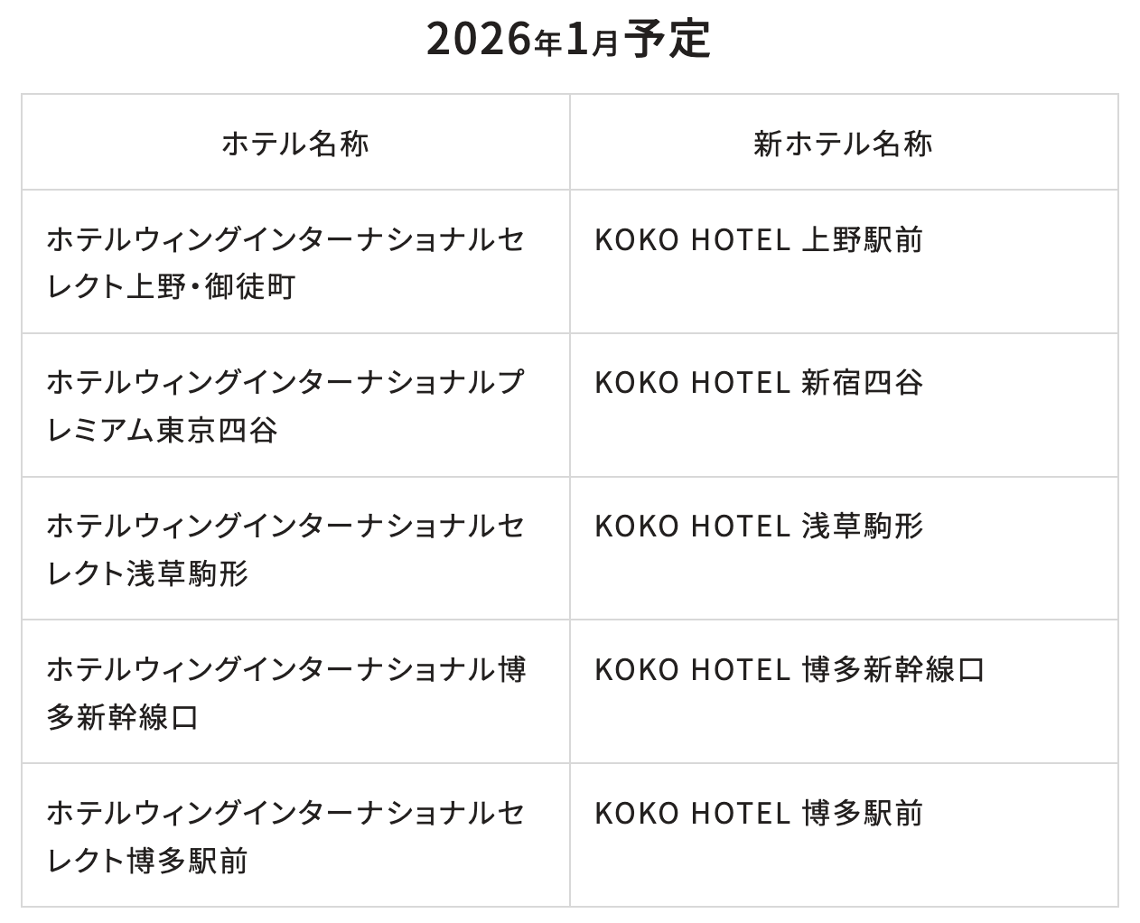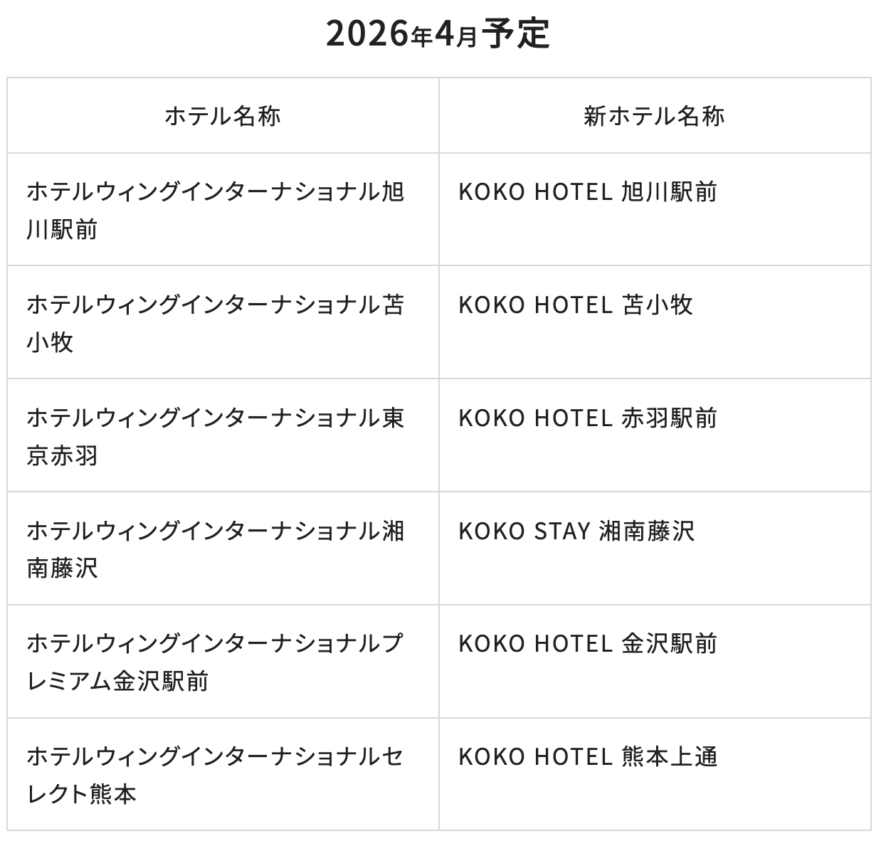 9月19日には6軒の「ホテルウィング」ブランドのホテルを「KOKO HOTEL」に、10月6日には3軒の「ホテルウィング」ブランドのホテルを「KOKO HOTEL」にそれぞれリブランドした。