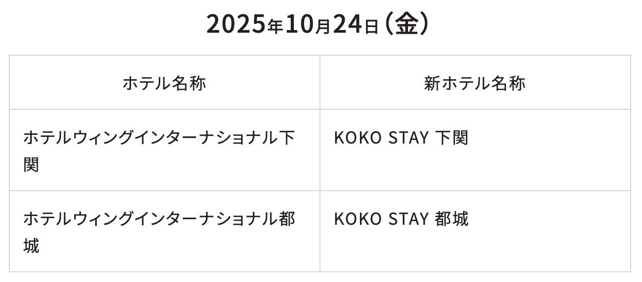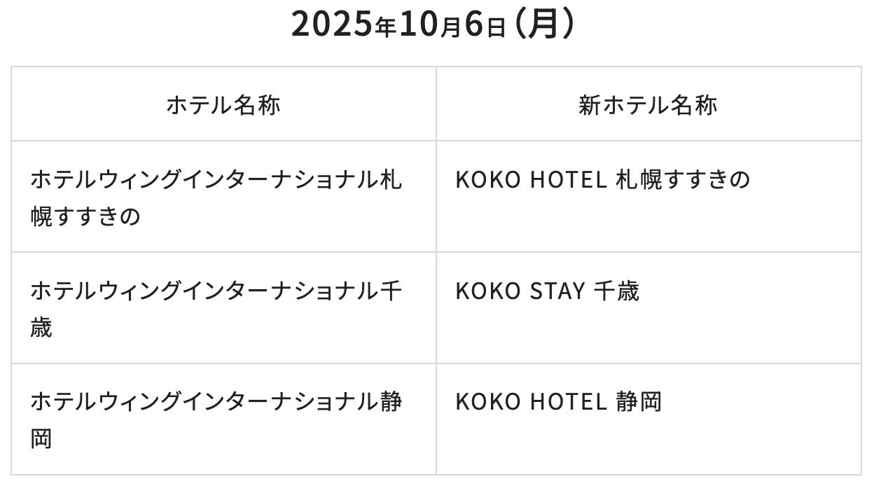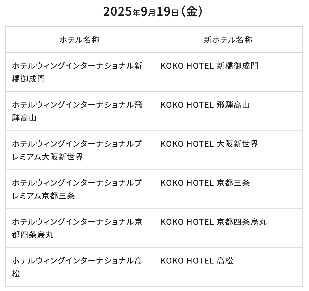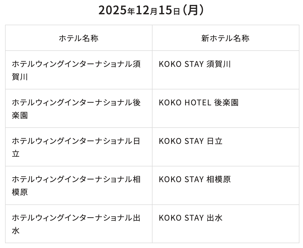 9月19日には6軒の「ホテルウィング」ブランドのホテルを「KOKO HOTEL」に、10月6日には3軒の「ホテルウィング」ブランドのホテルを「KOKO HOTEL」にそれぞれリブランドした。