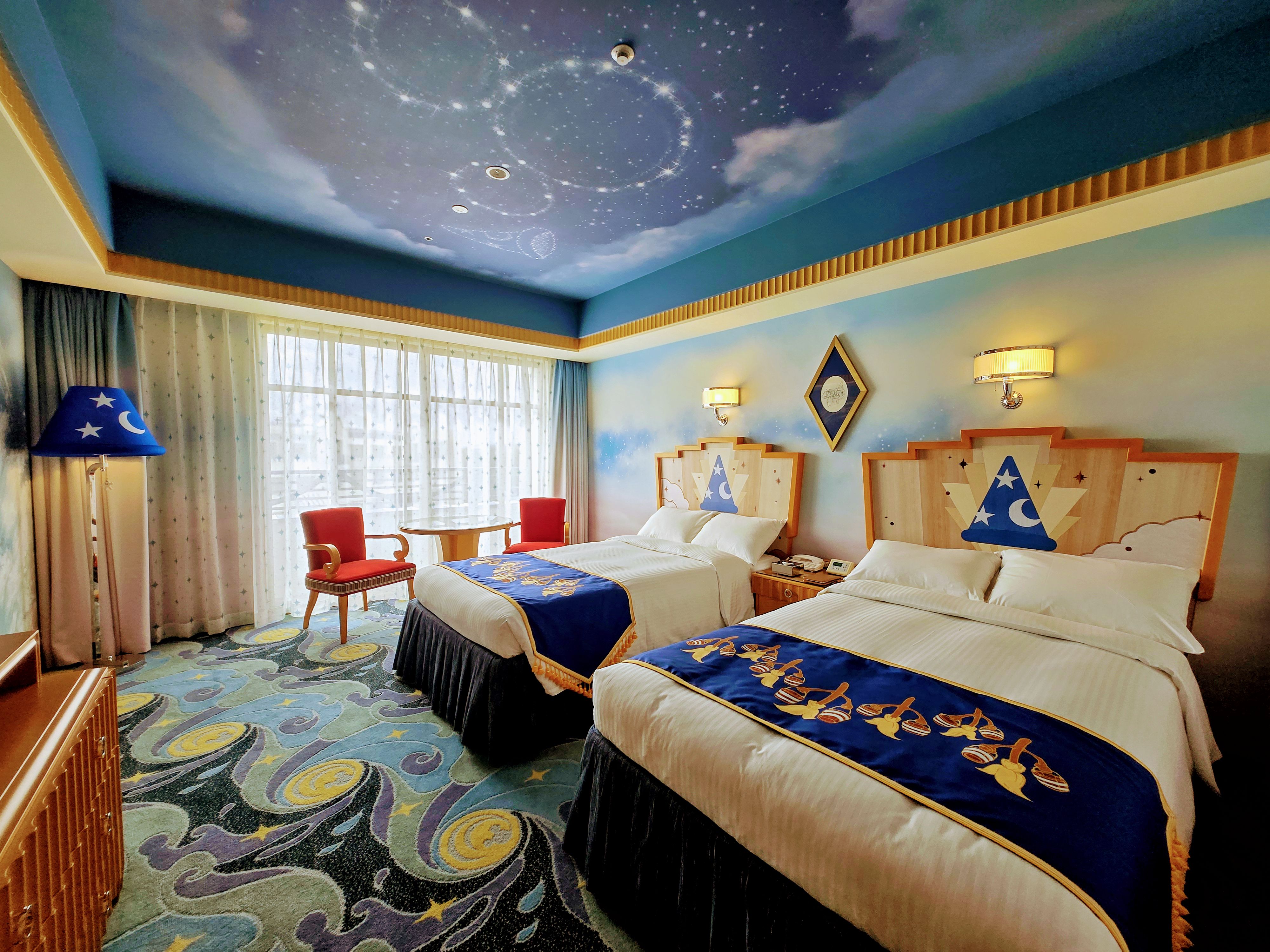 ミッキーマウスルーム(魔法使いの弟子)は、ディズニー映画『ファンタジア』の「魔法使いの弟子」の世界観を基に、星や雲をモチーフとしたデザインを採用。魔法をテーマにした装飾で、壁紙やカーペット、天井のデザインに至るまで作品世界を再現している。