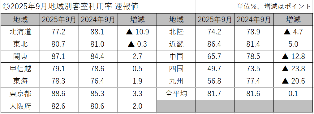 同調査によると2025年9月の全国平均は81.7%、前年同月81.6%と0.1ポイント増の結果となった。