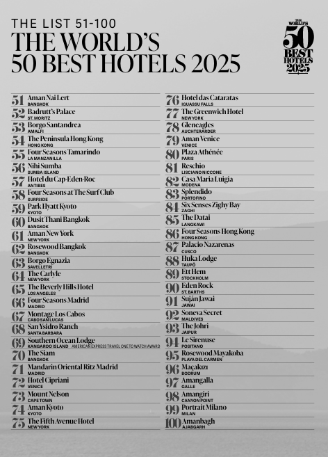 日本のホテルでは59位「パークハイアット京都」、74位「アマン京都」の2つのホテルがランクインした。なお、1位から50位までのランキング発表は10月30日を予定している。51位から100位までのランキングは以下の通りに列挙。