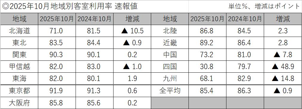 同調査によると2025年10月の全国平均は85.4%、前年同月86.3%と0.9ポイント減の結果となった。