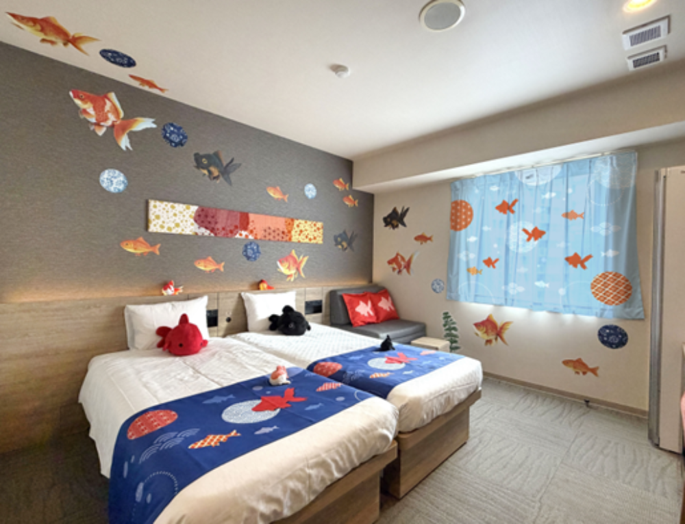 客室全体に金魚をデザインし、宿泊ゲストには金魚すくい飴、金魚の形のバスボムなどをノベルティとして提供。価格は1泊朝食付きで1万8000円(税・サ込み)~にて提供する。