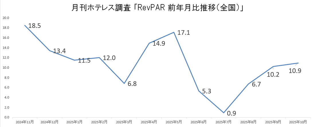全国平均の稼働率は前年同月と同水準で着地。大阪エリアでは大阪・関西万博の影響により開催期間中は好調に推移し、開催終了後の稼働率は抑え目になる傾向に。11月からは中国や香港からのインバウンドの減少が見込まれ、11月下旬時点では情勢の鎮静化がいまだ見えない見通しである。