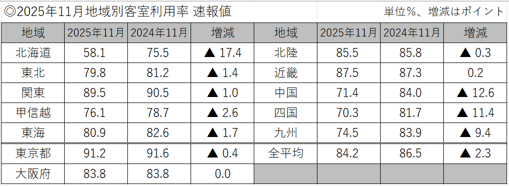 同調査によると2025年11月の全国平均は84.2%、前年同月86.5%と2.3ポイント減の結果となった。