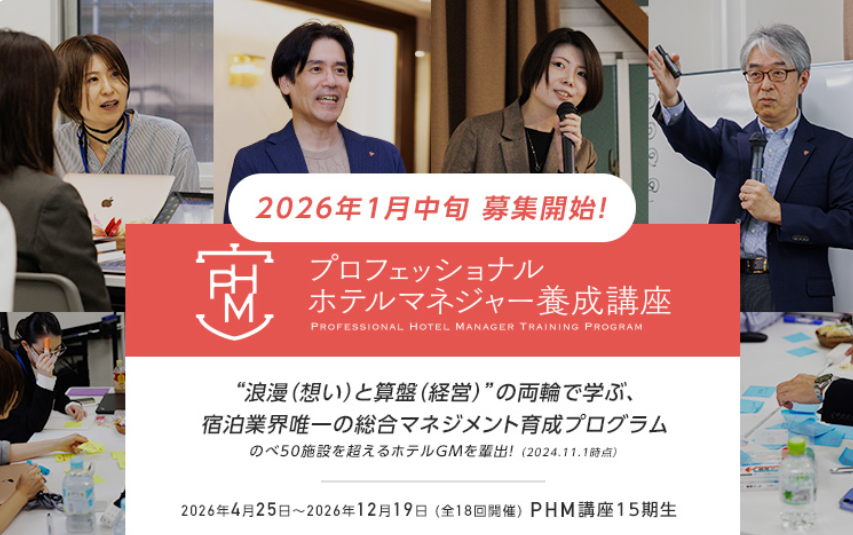 プロフェッショナルホテルマネジャー養成講座(PHM)は、宿泊業界で活躍する次世代総支配人を育成するための8か月に渡る長期・実践型講座です。 マネジメントの「ヒト・モノ・カネ」を軸に、理論・ケース演習・議論・アウトプットを重ねながら、現場で使える判断力と視座を養います。 講義を聞いて終わるのではなく「考え、言語化し、現場で試す」このプロセスそのものが、学びになります。