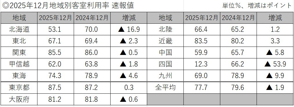 同調査によると2025年12月の全国平均は77.7%、前年同月79.6%と1.9ポイント減の結果となった。