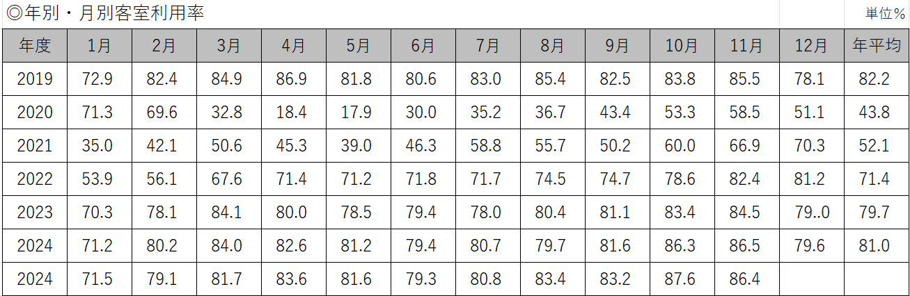 一般社団法人全日本ホテル連盟(本部・東京都千代田区)は1月13日、会員ホテルの2025年12月客室利用率の調査結果を発表した。回答ホテル数は235軒の協力ホテルのうち105軒、調査結果は速報値となる。