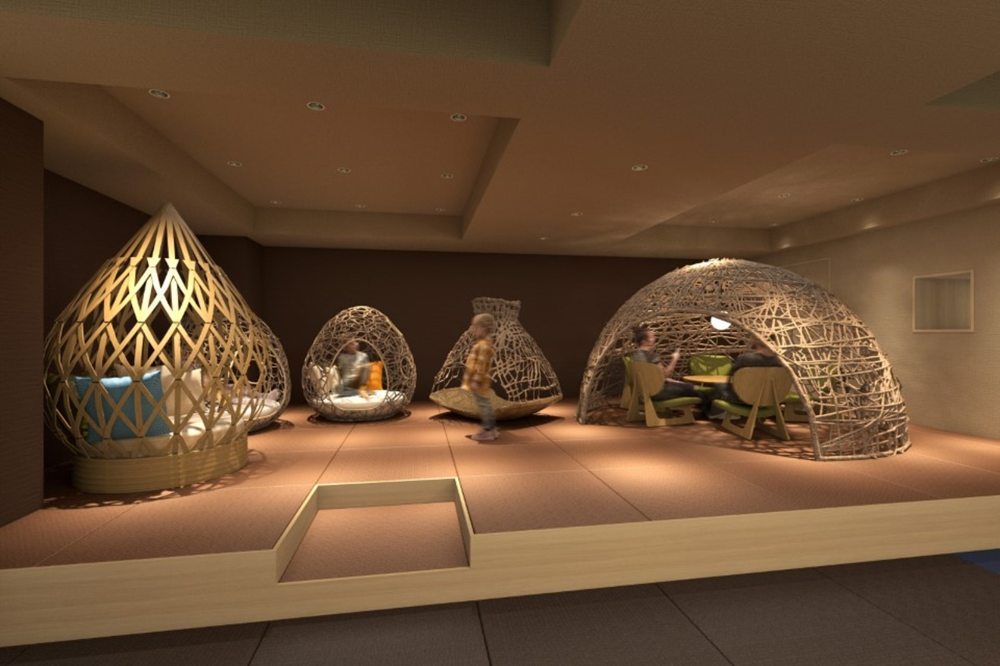 2階のオールインクルーシブラウンジ「一福(いっぷく)」ではドリンクやスナックを用意。ラウンジスペースにはテーブル席やソファ、キッズスペース、ライブラリーを設ける。1階ロビーに新設されるアメニティバー「しつらえ処 一楽(いちらく)」では、貸出枕や地元ならではのドリンクやスイーツを提供。2階から1階へ移設されたお食事亭「料理茶屋胡蝶(こちょう)」をリニューアル。夕食のコースはメニュー構成を2種類から3種類へと増やす姿勢である。