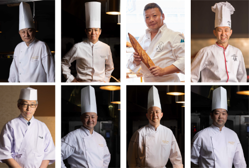総料理長の能登谷 憲司氏をはじめ、メゾンカイザー 代表取締役の木村 周一郎氏、メインキッチン シェフの原田 裕一氏、スーツァンレストラン陳 料理長の関根 忍氏、カフェトスカ シェフの辻 慎太郎氏、ペストリー シェフの田中 麗人氏、大志満 調理長の川田 勝也氏、クイーン・アリス シェフの河合 真吾氏らが腕を振るう。