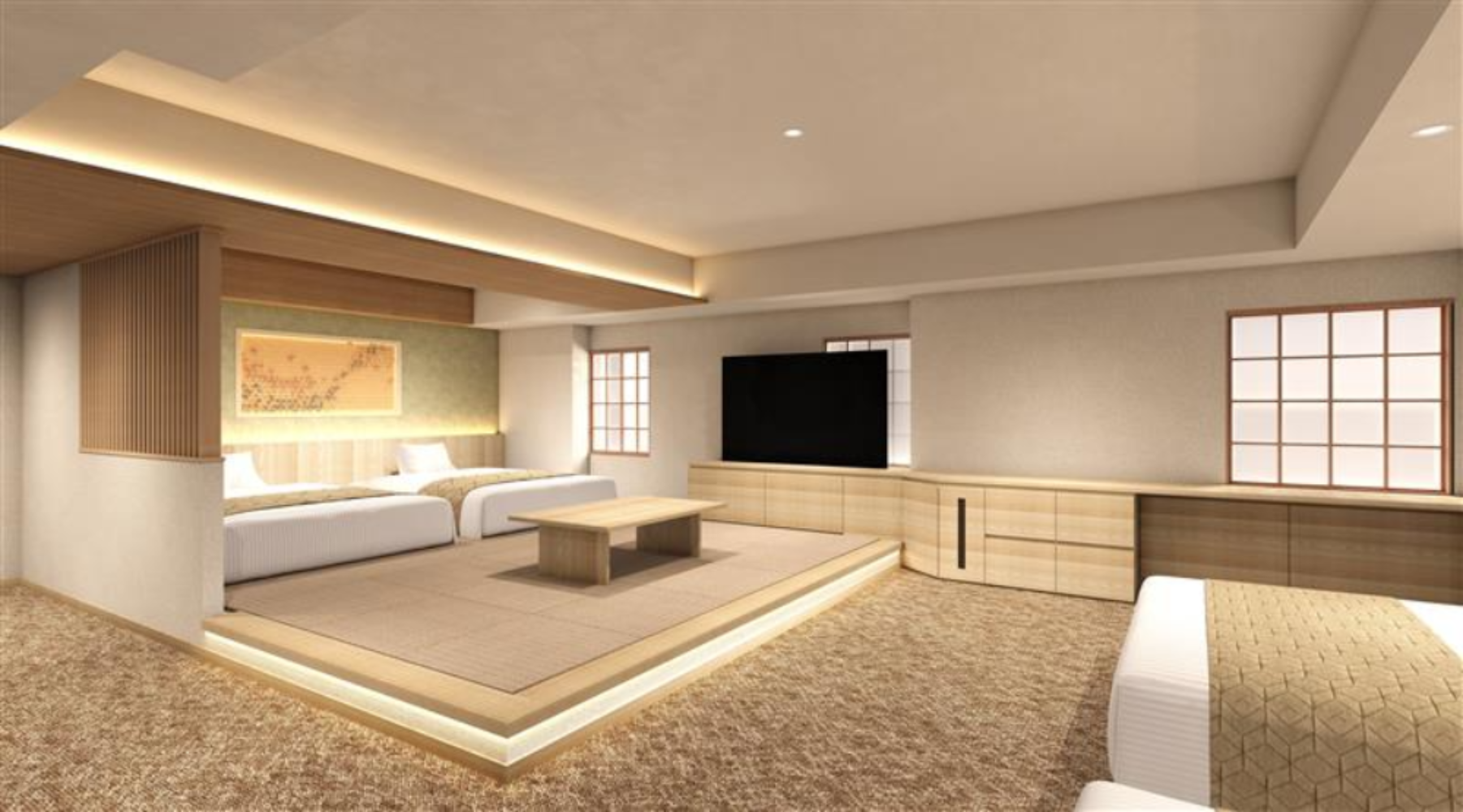 加えて、全客室の内装リニューアルを実施。家具の入れ替えを実施しシモンズ製のベッドを新たに導入。全室が18㎡以上で、複数名で宿泊してもゆとりのある空間を確保した。ロビーも植栽や素材感など随所に和洋の要素を織り交ぜ、心地よい空間を形成。同社は今後も多様化するニーズに応じたホテルのリニューアルを進め、ゲストがより快適に過ごせるホテルづくりに注力する。
