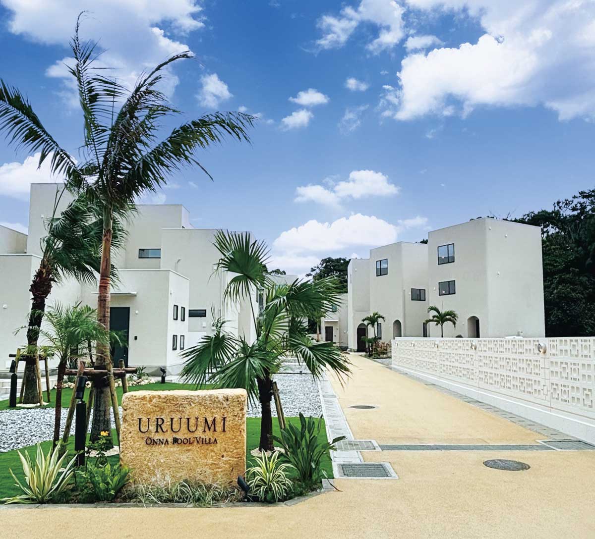 沖縄本島の中央に位置する恩納村の海岸沿いは、ハレクラニ沖縄やANA インターコンチネンタル万座ビーチリゾートなどのラグジュアリーホテルが建ち並ぶ人気のリゾートエリア。その一角に開業したのが総合不動産事業を展開する(株)ファミリーコーポレーション初のリゾート開発プロジェクト「URUUMI ONNA POOL VILLA」。土地の文化や自然に寄り添った設計がなされ、“ ゆいまーる(助け合い・つながり)” の思想を空間全体で体感できる宿泊施設だ。約2600㎡の敷地は街を作るように設計され、14棟のヴィラはゲストの視線が重ならないように配置されている。