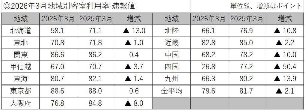 同調査によると2026年3月の全国平均は79.6%、前年同月81.7%と2.1ポイント減の結果となった。