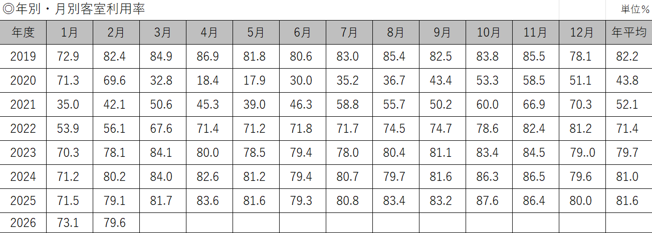 一般社団法人全日本ホテル連盟(本部・東京都千代田区)は4月10日、会員ホテルの2026年3月客室利用率の調査結果を発表した。回答ホテル数は233軒の協力ホテルのうち103軒、調査結果は速報値となる。
