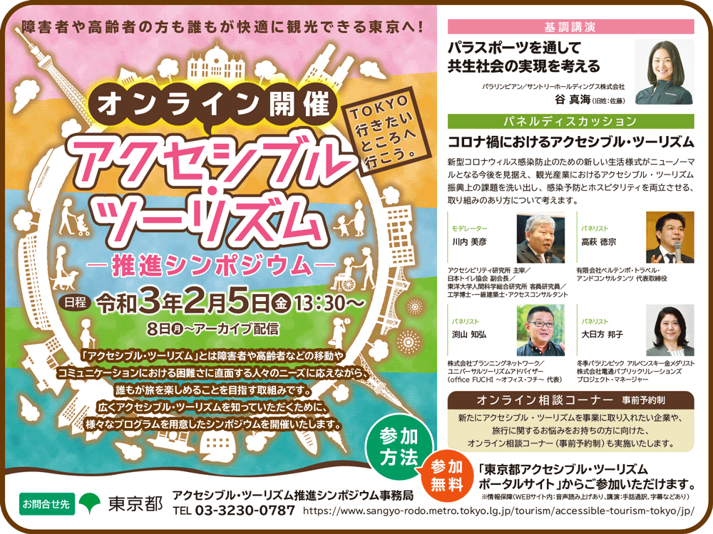 東京都が主催する「アクセシブル・ツーリズム推進シンポジウム」は、国内外から多様な旅行者を迎えるに当たり、障害者や高齢者等が安心して都内観光を楽しめる「アクセシブル・ツーリズム」の充実に向けた取組みの推進を目的としている。